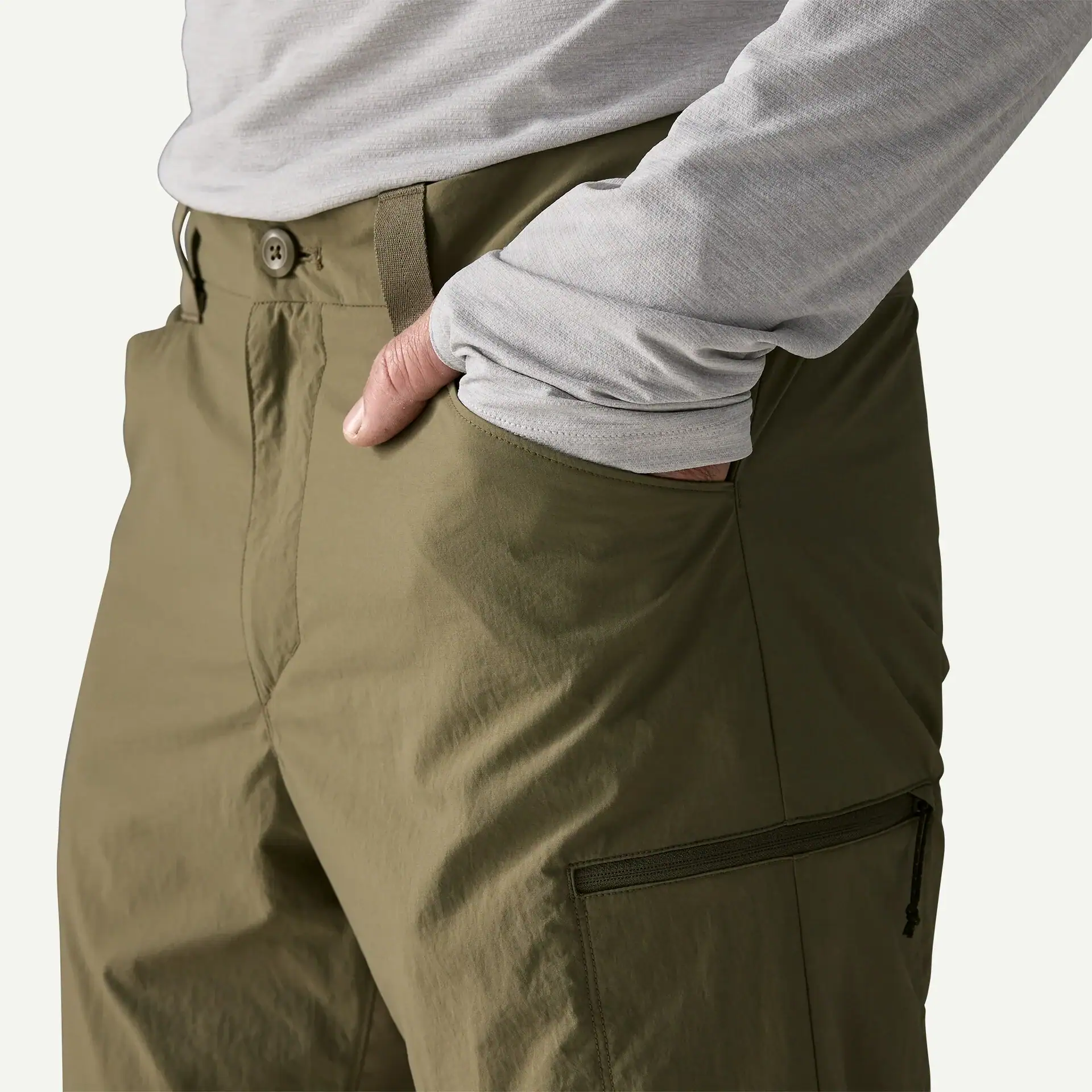 • Two front slash pockets with mesh drainage, one zippered security pocket on the right thigh, and one back-right zippered pocket