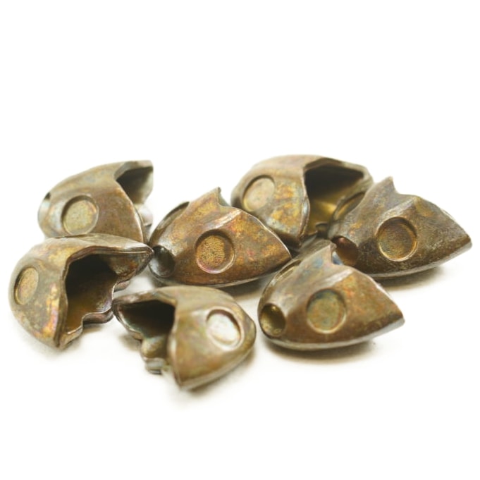 Fish Skull Sculpin Helmet are heavily weighted flattened heads that slide onto your baitfish patterns to drop them deep quickly. Each head has recessed sockets for 3D eyes which are included. Tie your fly with material up to the eye and leave room to slide the Fish Skulls on. Coat the head with Loctite super glue and slide the skull on. Finish with some small jam wraps of thread in front. We use the Helmets in saltwater as a fly version of a Skimmer Jig for flats species.